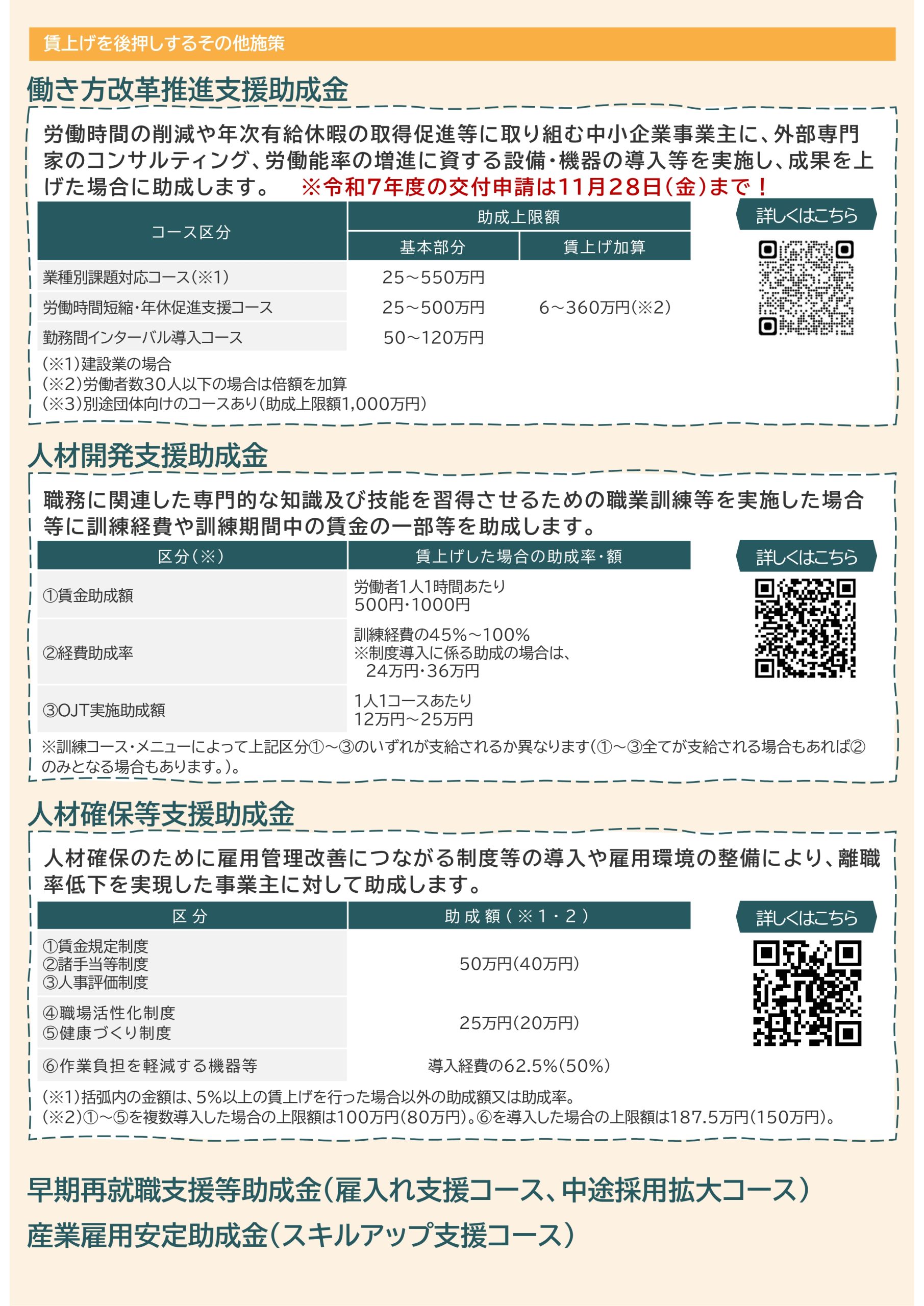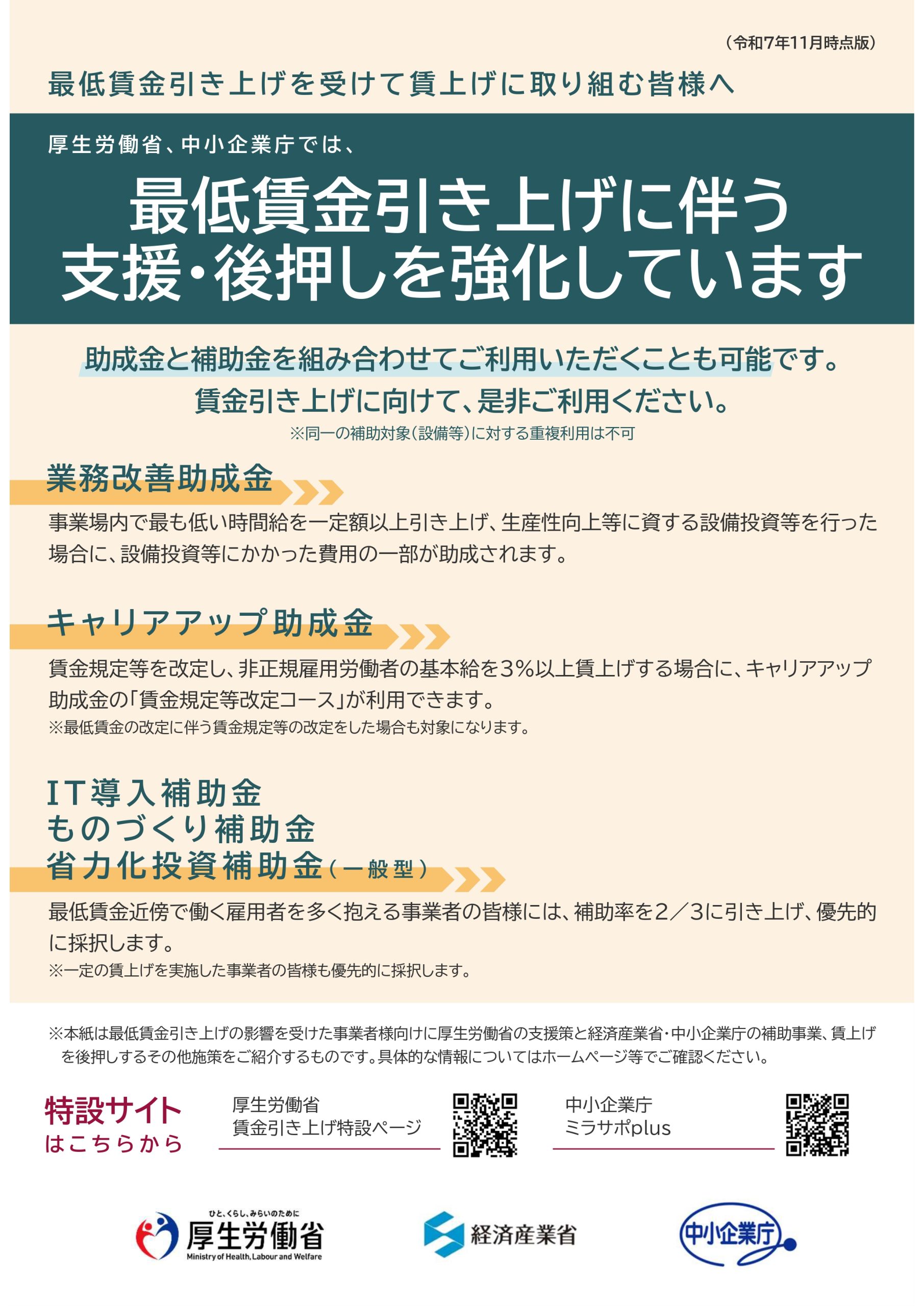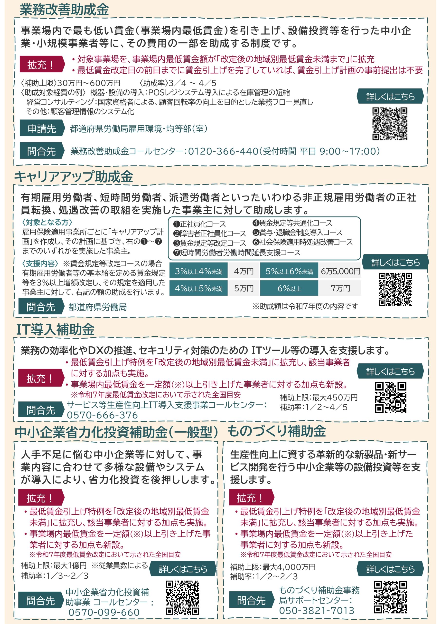 厚生労働省 酒田商工会議所 > お知らせ > 厚生労働省 【助成金】賃上げに取り組む事業者向けの助成金 2025年12月04日 厚生労働省 業務改善助成金について 2023年05月29日 業務改善助成金についてについて下記をクリックしてください。 詳しくはこちらをクリック 厚生労働省 最近の投稿 【助成金】賃上げに取り組む事業者向けの助成金 【セミナー情報】1/16 生成AIを営業・販促現場で活かす実践体験セミナー13:30~※締切1/9 【セミナー情報】1/22 多様な人材活用による企業成長に向けて14:00~ 【セミナー情報】接客・営業力向上研修 参加者募集! 【セミナー情報】夜間創業塾 参加者募集! 【セミナー情報】12/15(月)創業3年以内の方限定! あなたの事業に使える補助金が分かる補助金活用個別相談会 【セミナー情報】11/20(木)カスハラから従業員を守る 「攻め」と「守り」の経営戦略13:30~15:00 【ご案内】令和8年度新年賀詞交換会の開催及び名簿登録のご案内について 【セミナー情報】11/19 (水)「令和7年分年末調整説明会」のご案内10:00~11:30※午後からのセミナーは定員に達しました。 【セミナー情報】10/30,11/20創業3年以内の方限定!集客・売上・経営の悩み解決 個別相談会 カテゴリー 国税庁 厚生労働省 酒田市 山形県 経済産業省 当会議所 アーカイブ 2025 2024 2023 Copyrightc Sakata Chamber of Commerce and Industry All Right Reserved.