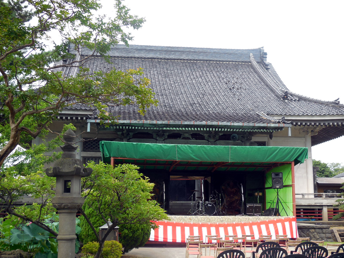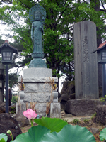 寄贈して頂いた観音像です。蓮池は現在の住職が丹念に育て、ようやく根がついて、花が咲くようになりました。古代蓮ですのでお盆の間は立派に咲いています。妙法寺の住職は代々、境内を浄土のようにして人々の幸福に尽くそうと心がけ、桜を植えたり,クロマツを植えたりしてきました。 |