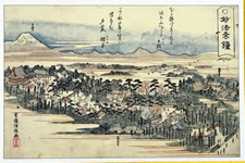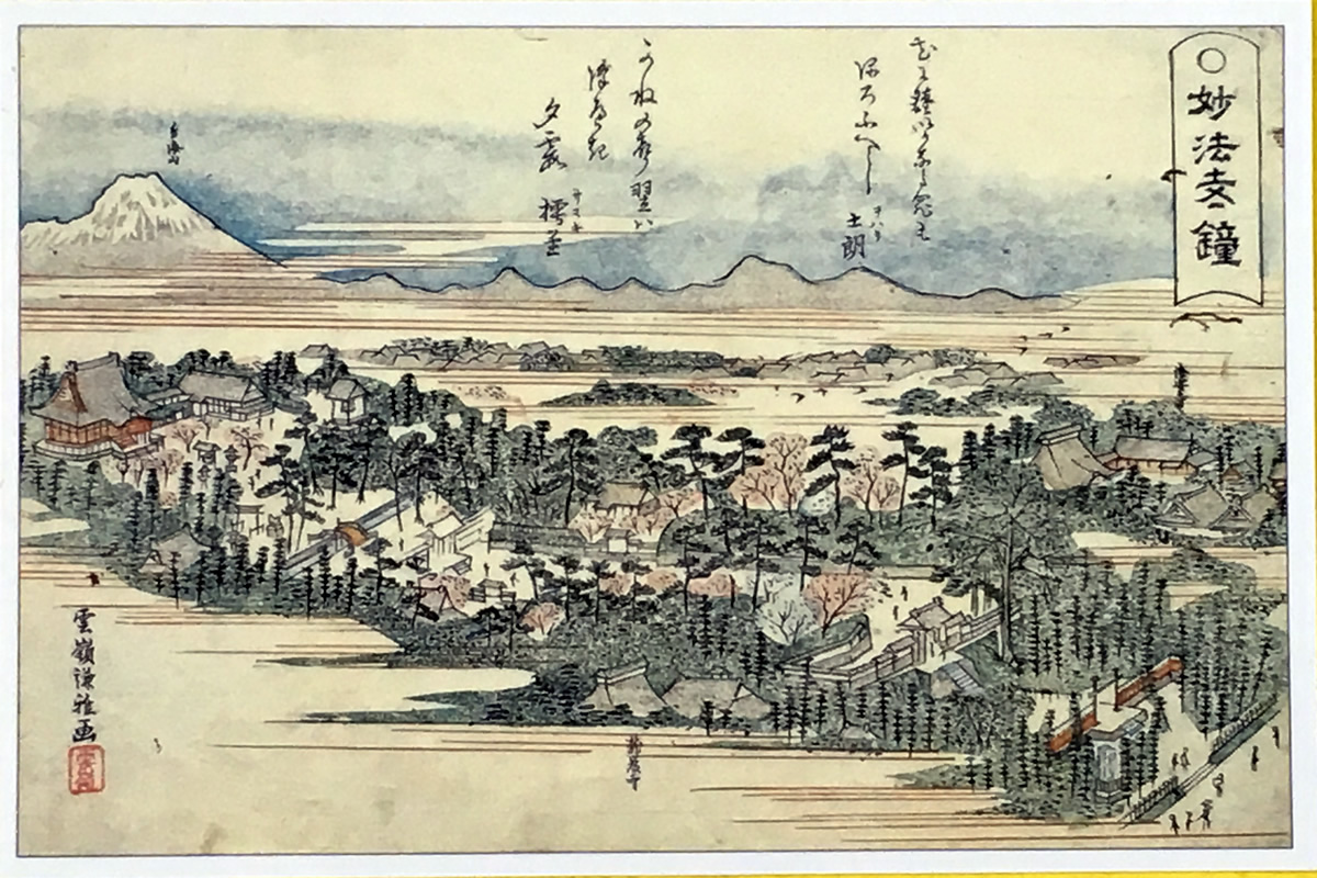 妙法寺の鐘の音は、浄土の鐘の音でした。十景には桜、祖父山、釣り鐘、題目塔など、現存する物が描かれています。 |