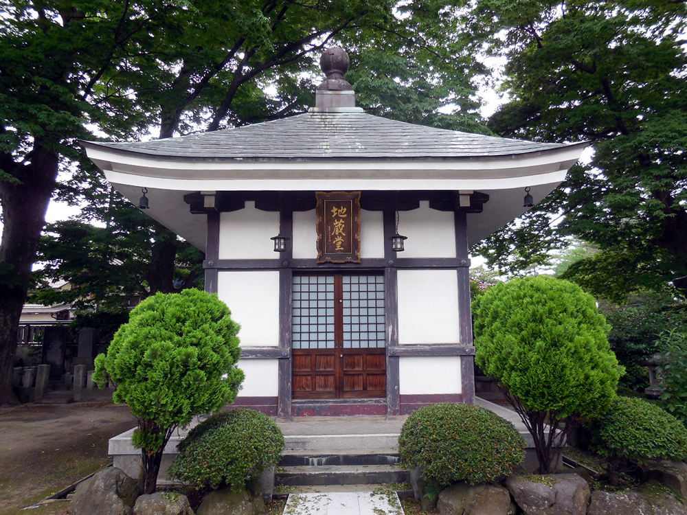 延命地蔵が祀られています。8月24日は、この辺りでいう森の山で、地蔵盆というお地蔵さんの供養の日です。本尊の前に、お地蔵さんを飾り、地蔵盆の供養をします。その時に分骨を納める方々は、そこに納めます。地蔵盆と森の山供養が混ざったような行事をしています。傘福がお堂の中に下がっています。 |