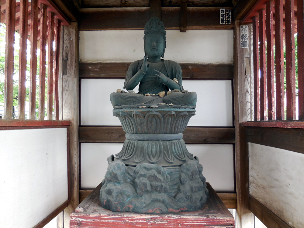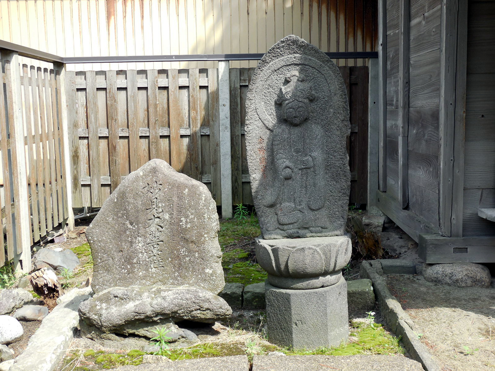 観音菩薩と地蔵菩薩が向かい合い座っています。菩薩観音は小野町の大工、粉河屋善右衛門が奉納したようです。地蔵菩薩は享保11年7月宝与道林という浄土宗の酒田の僧が六十六部として全国遍歴を完了した記念に供養仏として納めたもののようです。 |
