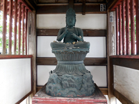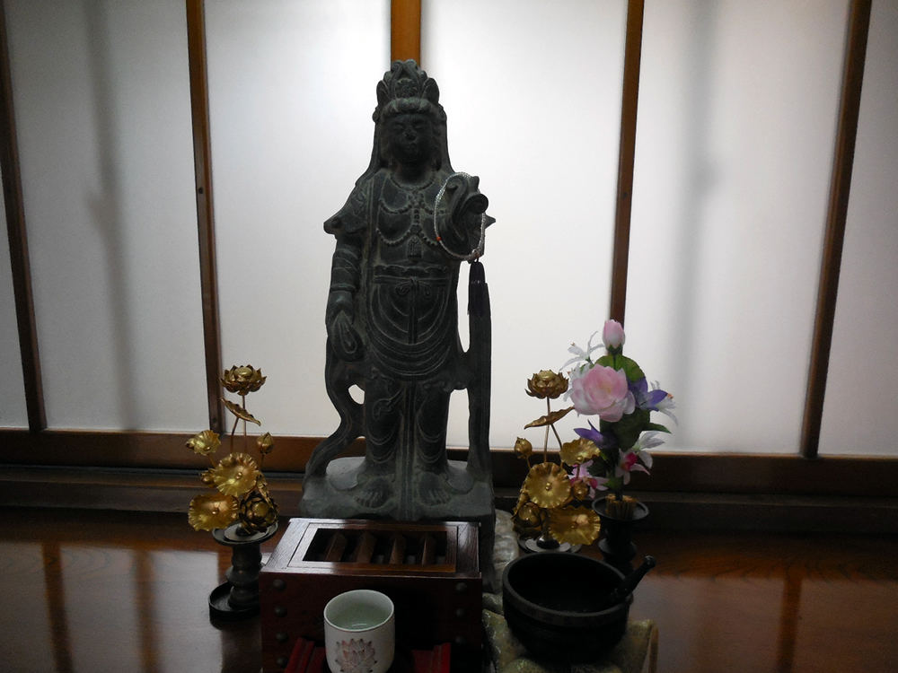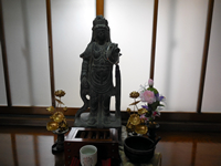 この観音様は、昭和51年の酒田大火の時に檀家さんのお庭で倒れていたものです。こちらに持って来られたので飾っています。とても優しい感じの観音像です。 |