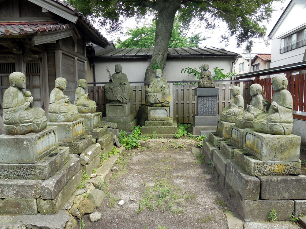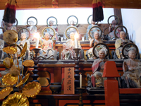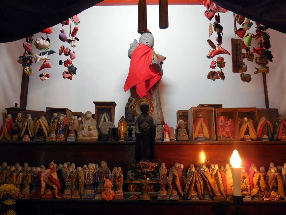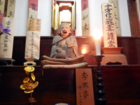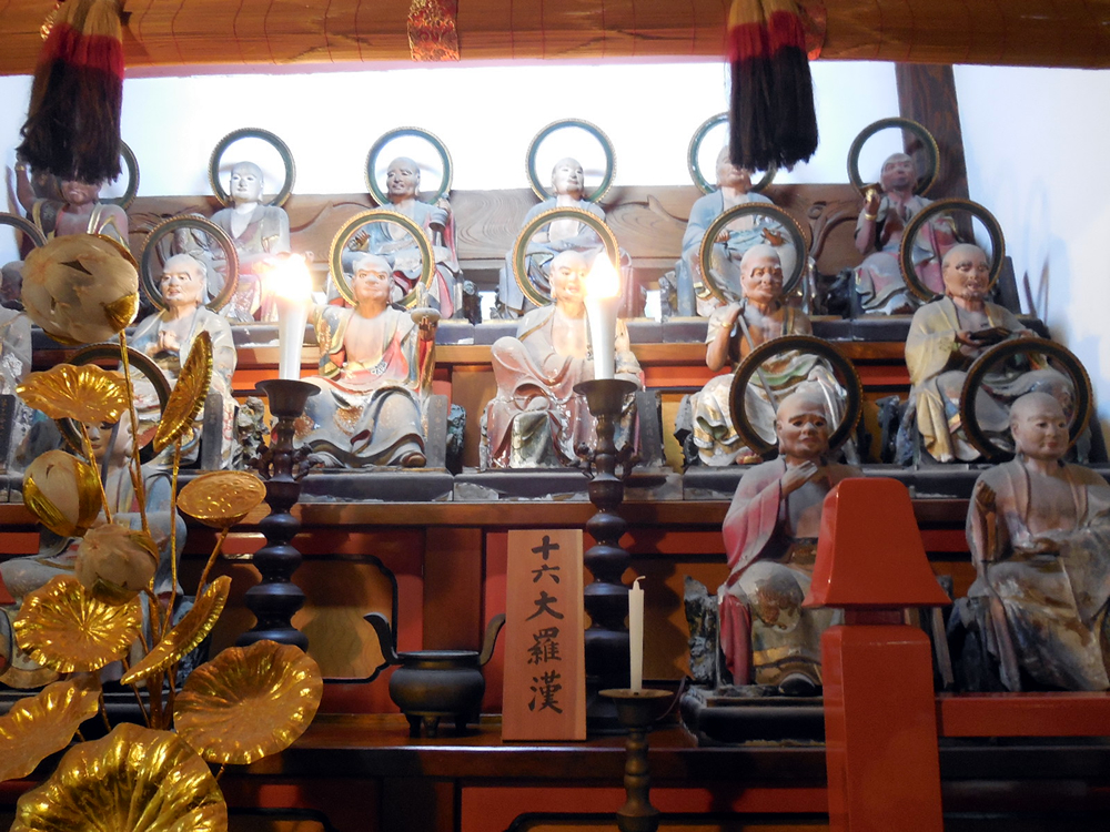 お釈迦様の弟子で特に優れた代表的な16人を十六羅漢としてお祀りしています。祀られている沢山の地蔵様は、お子さんを亡くした方達が納めました。ここに掛けられた傘福は、春になりますと、毎年あいおい美術館で展示する為、貸し出しをしています。 |