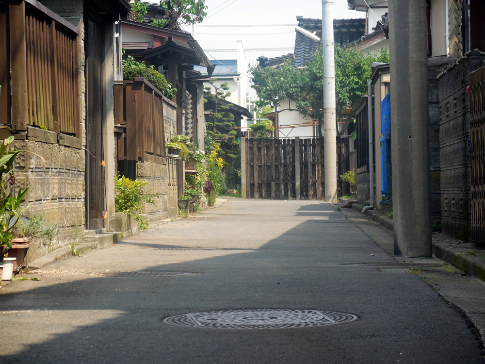 本慶寺の門を入って、左に曲がり車も通れない小路が今もあります。子供が地面に絵を描いて遊んでいました。太田医院裏の河瀬小路にでます。河瀬小路は河瀬長屋があったからで、河瀬屋は上中町の漆器木工業をしていた円山卯吉の屋号です。 |