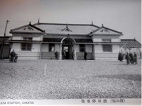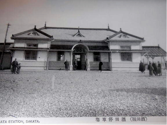 大正3年に酒田駅が西荒瀬村に開通しました。八雲神社の角から北東に曲がった田んぼの中で、砂越を発つ電車が見える程、何もありませんでした。大正14年、東宮殿下(昭和天皇)をお迎えした時に、酒田駅は西荒瀬だと、村長が殿下を先導したという話が残っています。天王下は谷地で傾斜があり、祖父山下、西山から砂を運び、平らにしました。 |