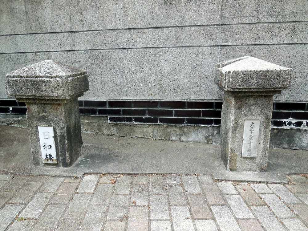 小さい欄干の跡があり、大正12年10月竣功と書いてあります。明治大正の頃は、八雲神社の境内がその日和橋まであったそうです。道路を作るということで、境内を提供しました。橋の大堰は、鷹町稲荷神社から、福徳稲荷を通り、本間美術館北側に流れていました。農業用水の堰で馬や牛を洗ったそうです。日和橋の南側を南水出、北側を北水出といったようです。昭和40年代頃まで、堰の名残と共に、日和橋もあったようです。 |