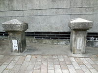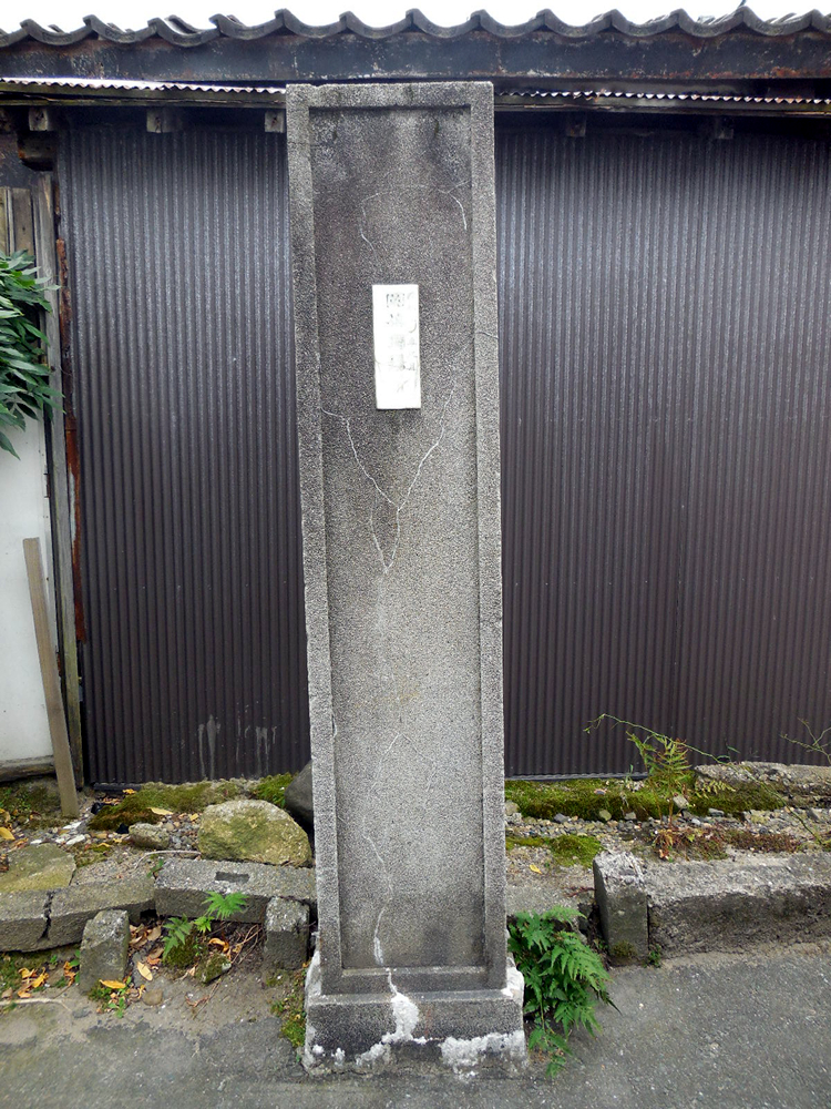 この小路は、左右衛門小路とも寺町新道とも云いました。十字路に昭和1?年(不明)に作られた国旗掲揚所の石柱があります。戦争に行く兵隊さんを見送ったのでしょうか。落雷で、ヒビだらけになっています。70年程、一度も国旗は揚げられていないそうです。 |