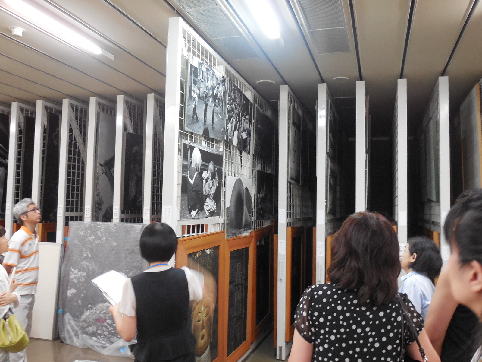 作品の保管 収蔵庫の作品は、欅の額に入った作品とパネルの作品に大別されます。保管は作品の大きさで分けています。大きい作品は、出し入れすると作品が傷みますので、額に入れたまま、ラックに掛けた状態で保管しています。これは、土門拳が生きていた頃に行った「古寺巡礼展」のスタイルを踏襲しています。小さい作品は、酸で写真が損傷するのを防ぐ為、黒い無酸紙で出来ている写真保存用の箱に入れています。箱にテーマと番号を記入し、必要な作品を一点ずつ出し額に入れて展示しています。収納庫には、ベタ帳や、フイルムをそのままのサイズで焼いた資料も保管されています。このベタ帳を丹念に見ていくと、この動きがあって、この動きに繋がって、この作品があるという理由がわかります。今は、スポーツ写真など、見ないで沢山連写し、撮った中から拾うそうです。土門拳の時代は、連写できるデジカメと違い、頭の中にシャッターチャンスを持ち、構えていたのではないでしょうか。自分で見つめて、これだと思ったところでシャッターを切るというスタイルだったと思います。 モノクロの場合は、今でも元のフィルムから焼くことが出来ますが、昭和30年代~40年代に撮ったカラーポジは、残念ながら、色が退色してダメになっています。元の原版からプリントしても赤茶けたような変な色のプリントしかできません。その為、カラー作品で発表されている二千点程だけを、デジタルで補正調整をし、保存して復元をし、そこから、新しくプリントをしています。実はモノクロのフィルムも劣化が始まっていて、その保存管理が課題となっています。写真界全体でも、現在大きな問題になっています。 |