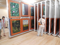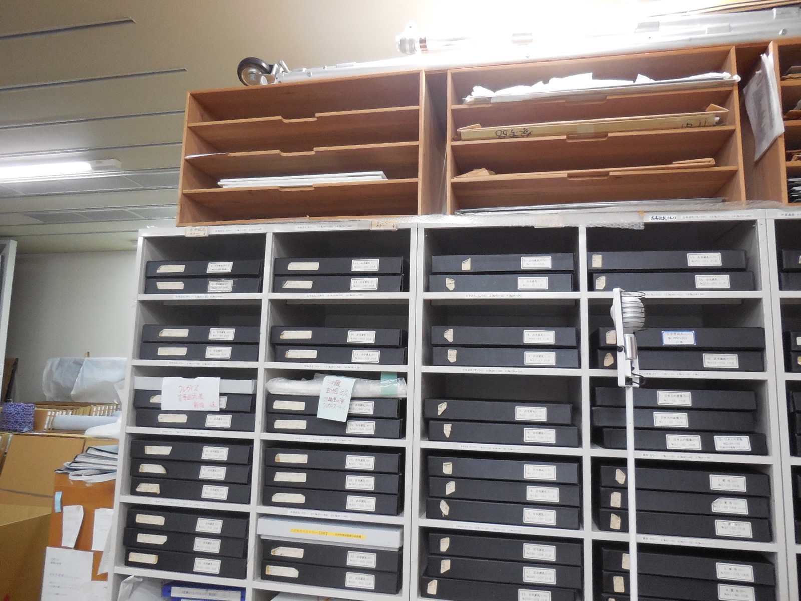 特別収納庫 一年中、温度16度に保たれています。作品の原版であるフィルムを保管し、公開できない部屋です。フィルムには、35ミリ、ロクロク(6㎝角)、ロクキュウ、シノゴ(4×5インチ)等の様々なサイズがあります。ガラスの板状のフィルムもあります。昭和25年、一番最初にカラーフィルムで撮影し、その後はシノゴサイズのポジフィルムを使っています。「古寺巡礼」は殆どがシノゴサイズのカラーポジです。 | |||