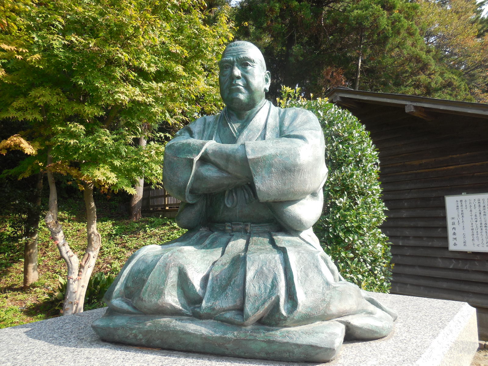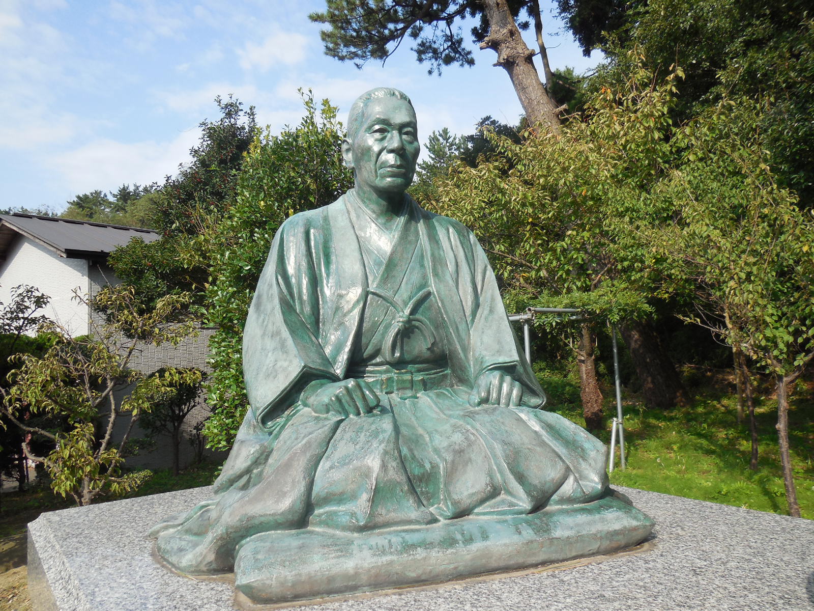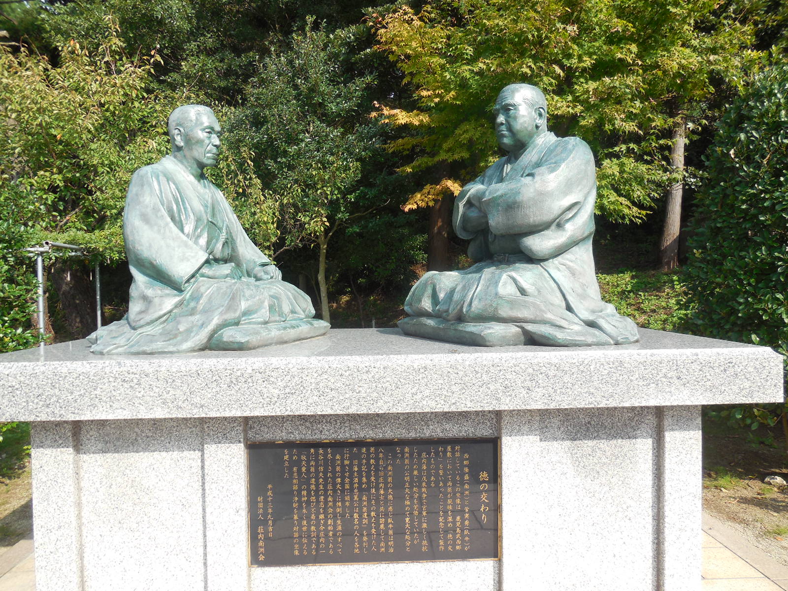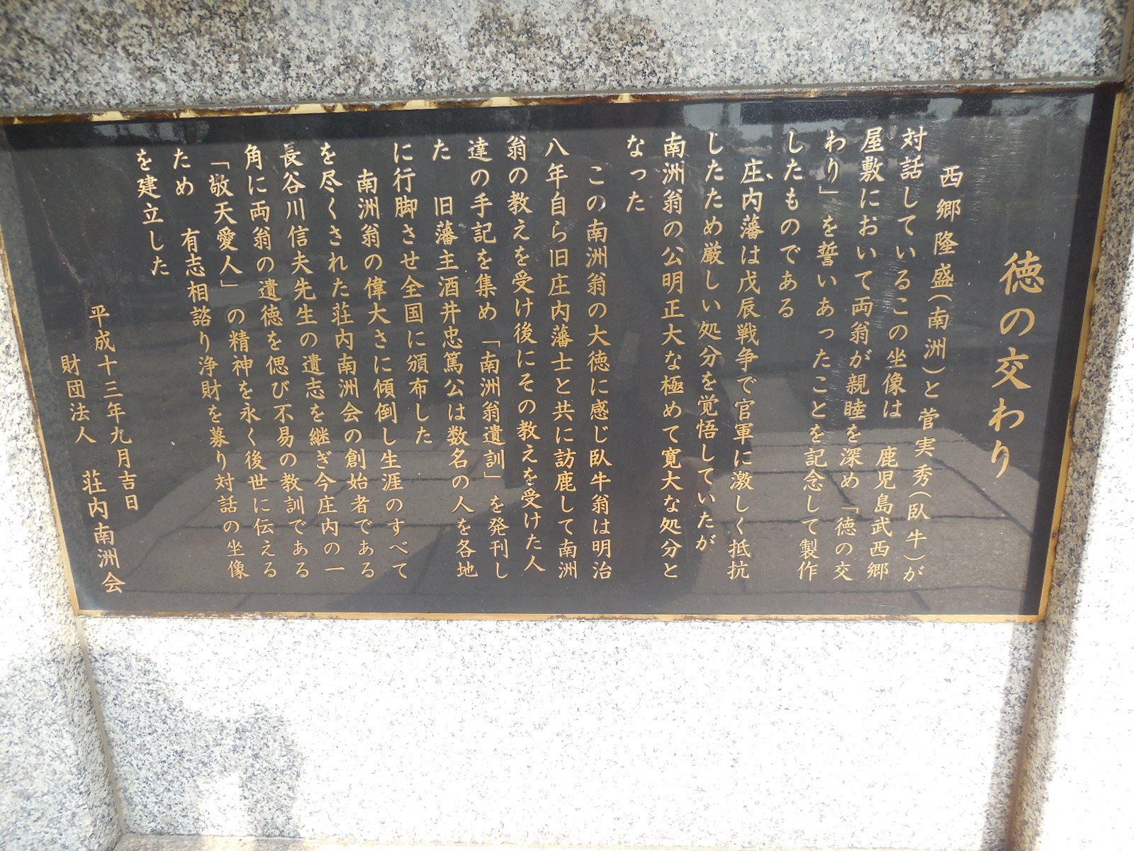 徳の交わり この銅像は、右側が西郷隆盛、左側が菅実秀です。西郷隆盛の南洲は南の島という意味で、島流しになっていたことからつけられました。菅実秀の臥牛は鶴岡の酒井藩の中老であった菅実秀の家から月山を見ると、牛が寝そべっているように見え、それがお気に入りで、自分の雅号を臥牛としました。明治元年、戊辰の年1月3日、鳥羽伏見の戦いが始まります。戊辰戦争の発端です。東北一円でも戊辰戦争の戦いがありました。新潟長岡、会津藩が降伏する中、酒井藩は一番最後まで戦いました。しかし9月27日に帰順降伏しました。その日、西郷隆盛は荘内に入り、致道博物館の近くに二晩宿泊してます。酒井藩のお殿様は、厳しい処分があると覚悟をしました。ところが、西郷先生の計らいで王道的な敗戦の処置で終わったのです。それに感動した当時の酒井忠篤(ただずみ)公は、明治3年に76名で鹿児島まで行き、西郷隆盛に教えを請いました。その後、選りすぐられた藩士が鹿児島に行き勉強をしました。当時の道中日記によれば、約1,800㎞を1時間で4㎞、1日10時間で40㎞歩き、1ヶ月以上かかったようです。菅先生も明治8年に鹿児島に行き、様々な教えを頂きながら、西郷先生と歓談相照らし、「徳の交わり」を誓いました。この銅像は鹿児島の武屋敷に全く同じものがあります。鹿児島で作った物の型を借りて作りました。庄内藩のお殿様を始めとした人々は、鹿児島の西郷隆盛が住む武屋敷を訪ねました。現在は公園になっています。残っているのは井戸だけで、松の木も当時の松ではありません。この「敬天愛人」は天を敬い、人を愛するという意味です。左側に南洲書と書いてあります。これは西郷先生が作った言葉ではありません。敬、天、愛、人の文字そのものは、中国古典の書経の中にでてきます。西郷先生は勉強を重ね、文字を組み合わせて「敬天愛人」にしています。西郷隆盛は、自分で作った言葉は「南洲」、そうでない時は「南洲書」と最後に印します。 | |||||