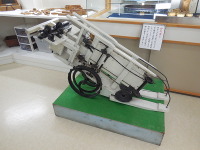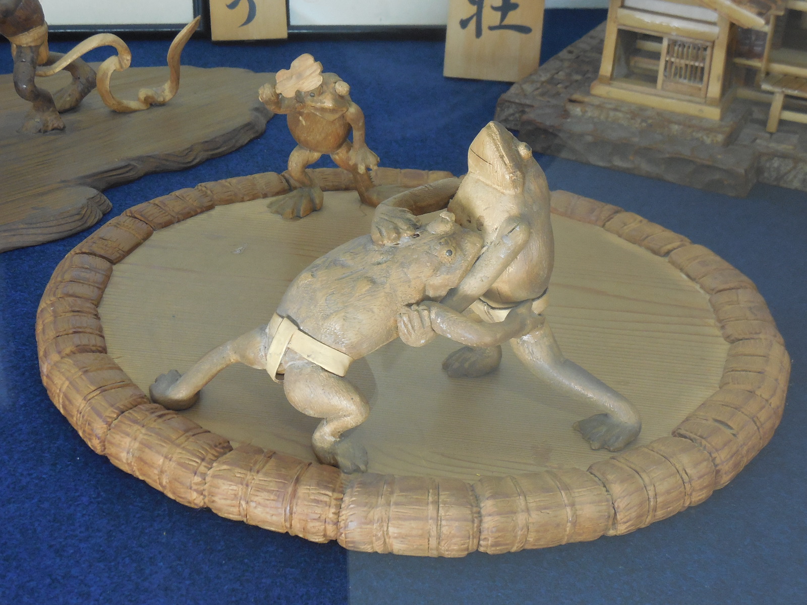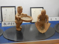 1年6ヶ月かけて作った大阪城の天守閣は、門を開け閉めすると、本物と同じ「キィー」と音を出します。京都の竹でないと出ない音です。巻紙になっているお経を6百巻収めている経蔵、蛙の人力車の綽、これらは10万円の保険をかけ、東京の三越デパートに出品し、天覧され、厚生大臣賞を頂きました。昭和35年、天皇、皇后、三笠宮様が、石井梅蔵の作品をご覧になっているご様子が写真に残されています。 石井梅蔵の作品は、建物だけではありません。相撲の取り組みをしている蛙は柏鵬時代を現し、行司も鶴岡出身の木村庄之介を現しているそうです。竜宮城はお孫さんの為に作りました。魚の鱗や魚籠を木目の表情で使い分けています。白鳥の湖の感じを出すために鏡を利用しています。 農機具が、手作業から農機具に移る課程を彫刻した作品は、明治百年祭を記念して百体作る予定でした。32体で終わりましたが、一体一体心を込めて作っています。昭和44年、74歳の時、モスコーの老父という彫刻を元に製作した作品が最後で、以後、中脚にかかり、作品はありません。 全盲でありながら、心眼で沢山の作品を作り上げました。自分の指を10人の職人と呼び、。鶴岡盲学校の生徒に、全盲でもこれくらいやれることをよく話し勇気づけました。発明と工夫で苦難を乗り越えた人の偉業に驚くばかりです。 |