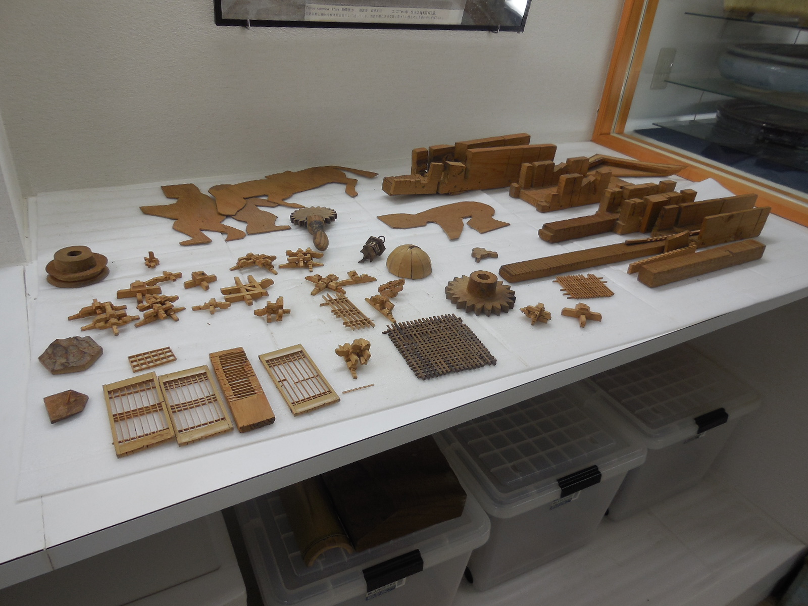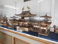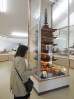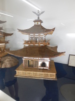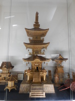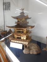 石井梅蔵の作品 石井梅蔵記念館には、全盲の人が一人で作ったとは思えない、見事な作品が展示されていました。作品の元となる部品作りは、石井梅蔵ならではの工夫でした。寸法は自分の五体を使い、指と指の間の寸法、腕の寸法などから割り出しました。材料や色味の違いは、舐めた味で判断しました。主に150年から200年の欅の皮を用い、竹釘を一本一本手作りし、平面図を取ってから彫刻し、竹を小さく切って組み立て、一つ一つの細かいパーツを作りました。苦難の末、全盲から4年経た昭和28年、最初の作品である五重塔が完成しました。しかし、東北の竹は虫が付きやすく、黴びやすかったのです。完璧を求め、昭和38年に同じ五重塔を再び作りました。高さが3メートルありますが、十段階程をはめ込む作り方で、地震がきても倒れない設計になっています。これは羽黒山の五重の塔と大山の善法寺の五重の塔の二つを組み合わせて作ったものです。家人が京都、秋田の材料を取り寄せ、助手や専門家の手も借りず、一人で部品作りから組み立てまでを行いました。一日8時間作品に没頭し10ヶ月で作り上げました。前半の5ヶ月はパーツ作り、後の5ヶ月は組み立てに要し、作業着の右の袂に右の部品、左の袂に左の部品を入れました。 | ||||
