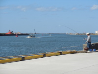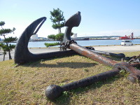 大きなイカリが置かれています。釣りやスケボーを楽しむ人がいます。歩きやすいウッドデッキになっています。 | |||||