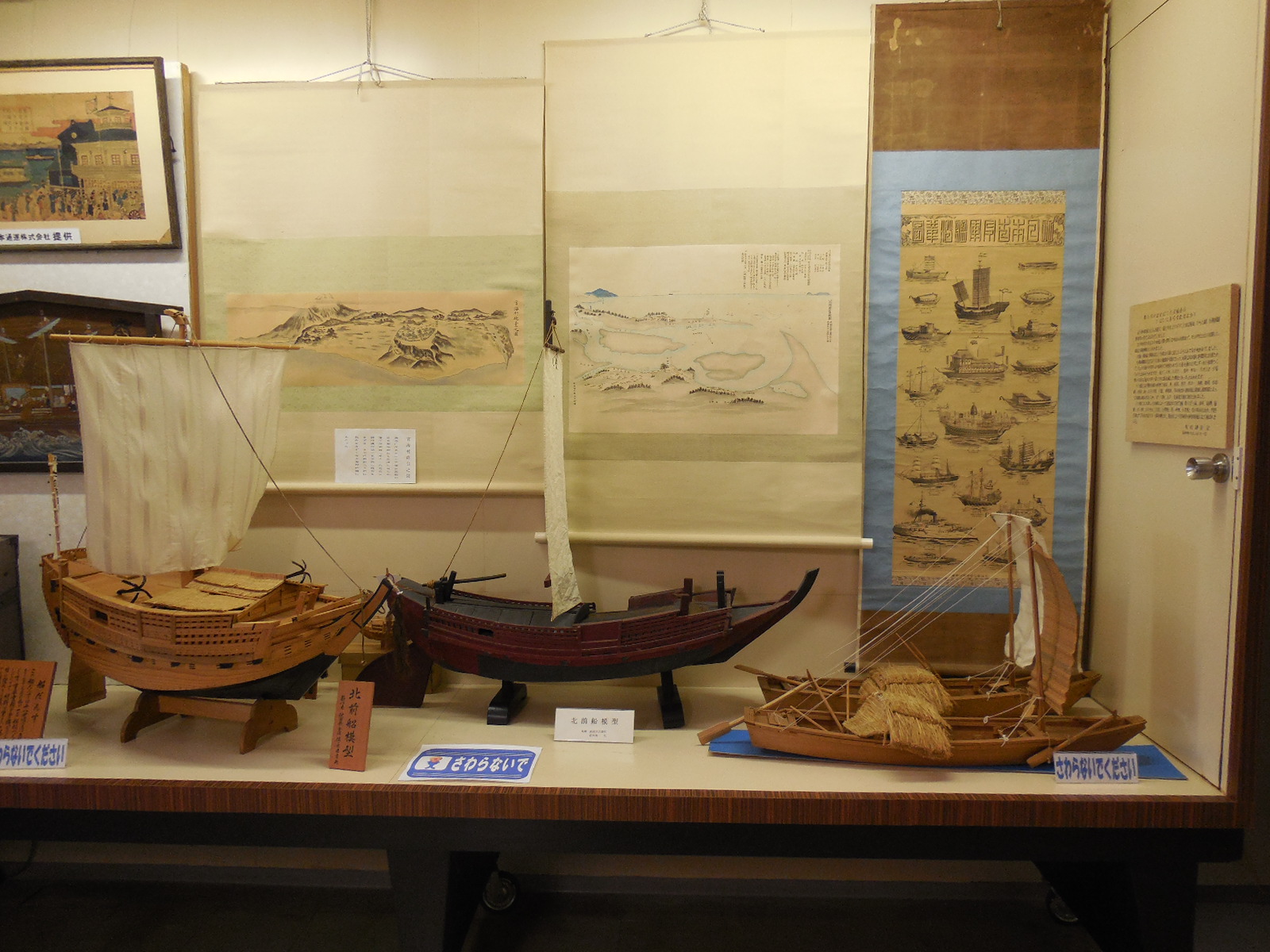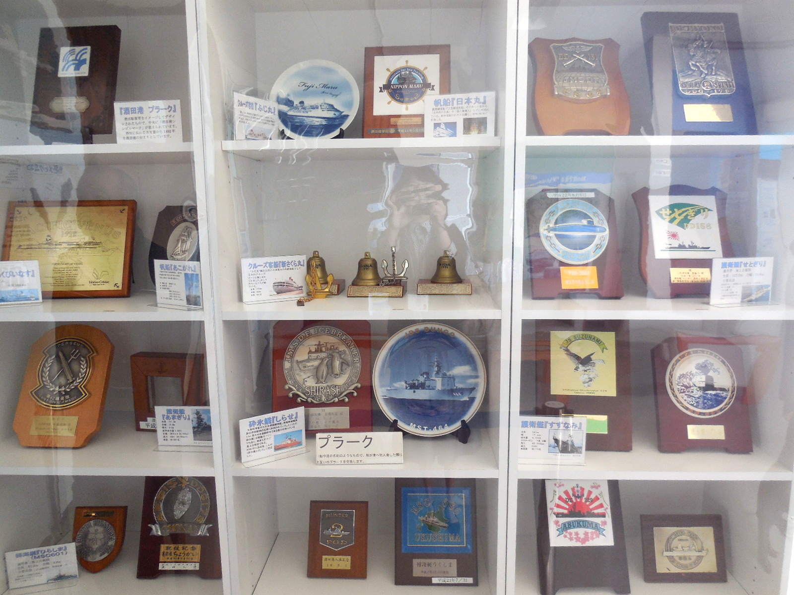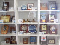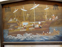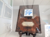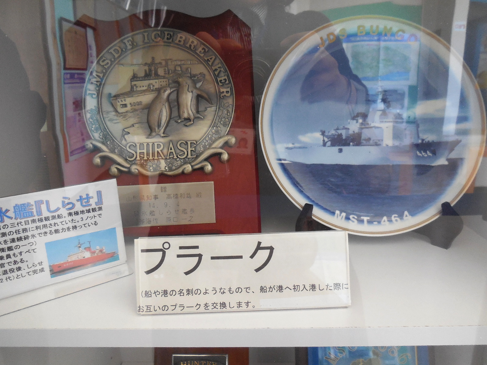プラーク 酒田港に寄港した船のプラークを展示しています。プラークとは、船が始めて入港した時に、知事宛に贈られ、こちらの方からも酒田港のプラークを渡します。酒田港のプラークは船ダンスの模様です。安全航海を願って名刺交換のかわりに渡します。 | |||