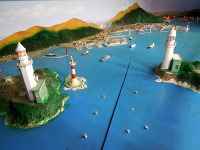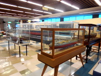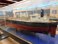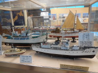 航海部門 商船や浚渫船など様々な種類の船があります。石川島播磨重工業の船は酒田北港の火力発電所に油が初入港した時の船です。工事船やその他の船は現在使われている船もあります。この模型のキッドは売っているものではありません。船が作られた時に模型が2艘ぐらい作られます。全て手作りで、原寸から割り出されています。 | |||