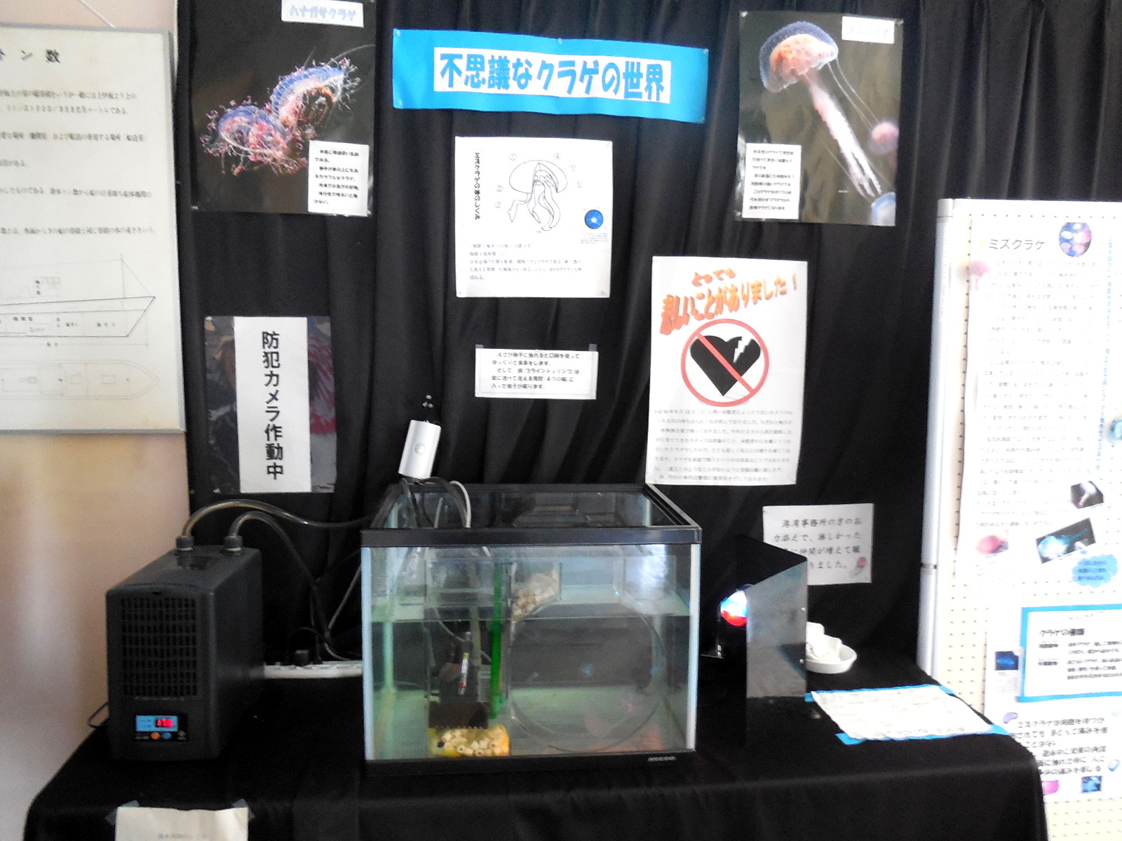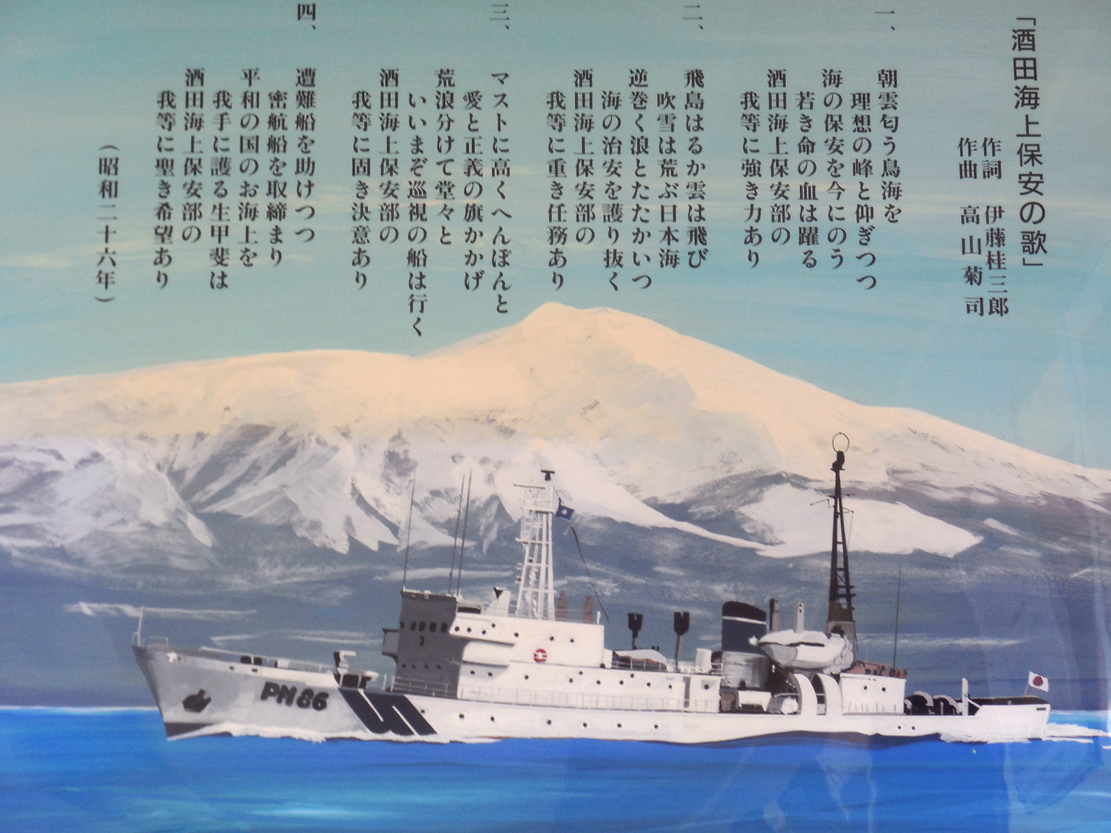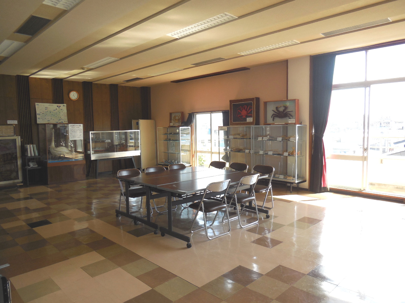 昭和46年から展示物はそんなに変わってはいません。新しい展示物としては、商工会議所女性会から預かっている傘福、加茂水族館から頂いたくらげ、庄内竿、大漁旗などがあります。大漁旗は展示だけでなく飛島丸が出航、入港する時にこちらで振っています。鯨の骨もあります。 | |||
