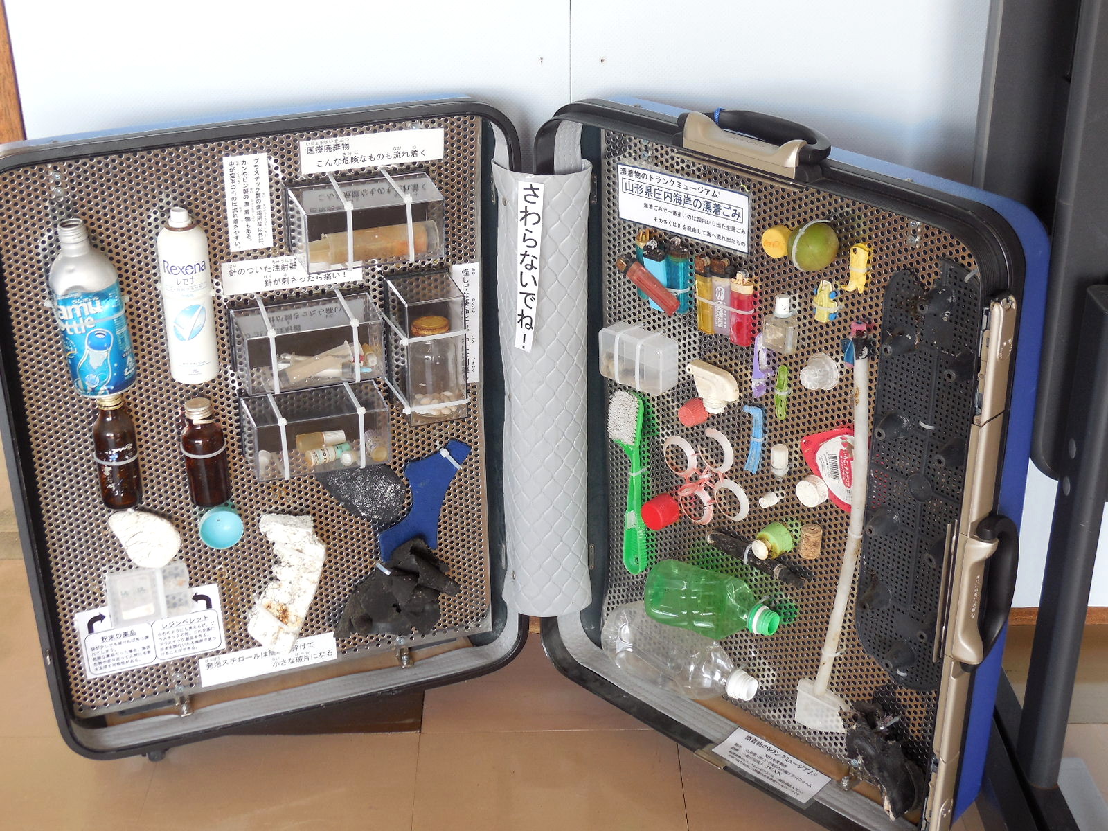 海上保安庁の常設展示室 環境保全の展示があります。 鯨の骨です。宮野浦海岸から拾ってきました。土に還るものならいいのですが、プラスチックのゴミはなくなりません。だからゴミを捨てないように話をしています。 |